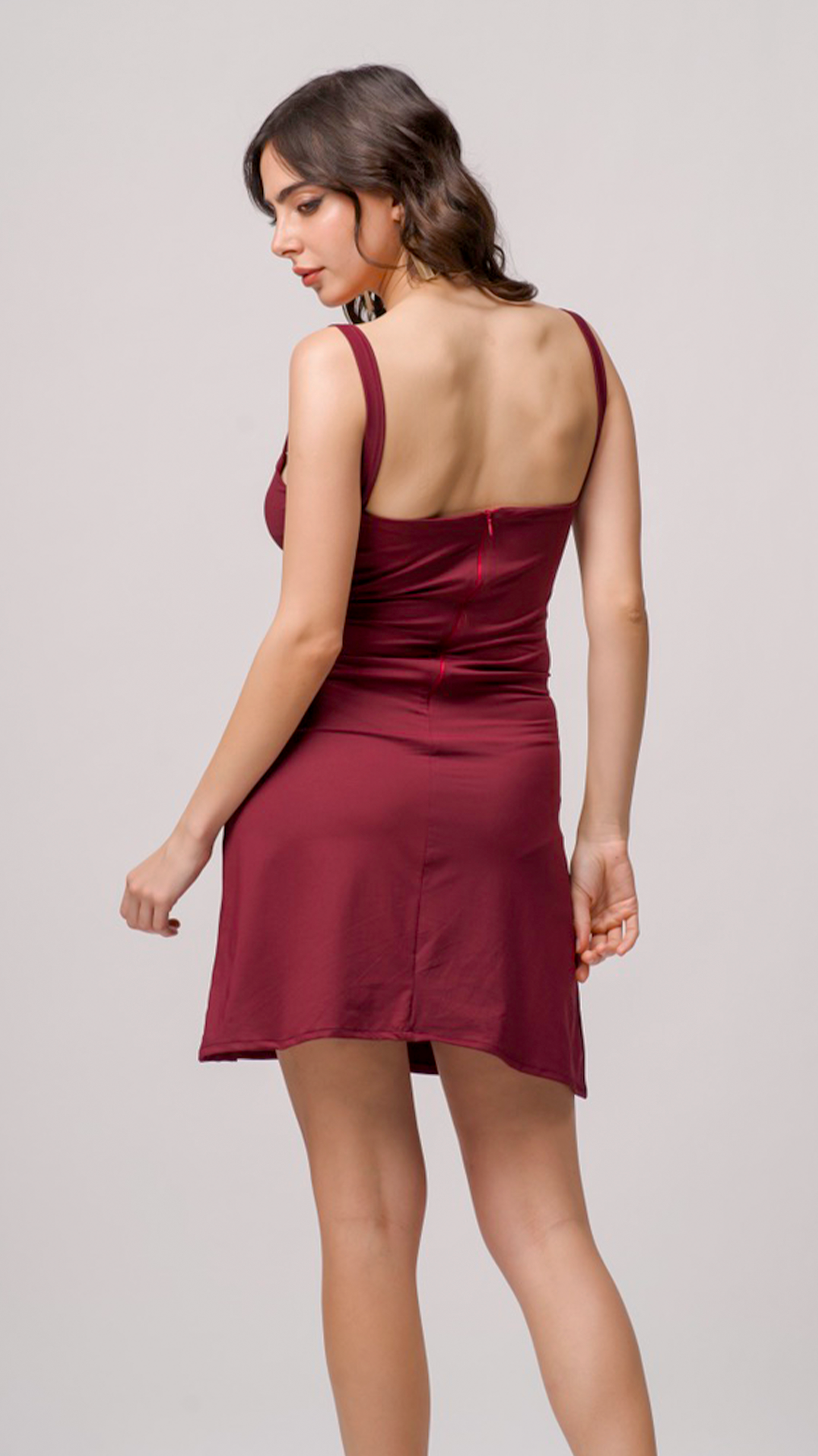 Step effortlessly into this party-ready burgundy mini dress. The flattering square neckline and structured straps give it a timeless appeal, while the flared silhouette adds a playful vibe. Made from a blend of nylon and lycra, it’s designed for a perfect fit. The concealed back zipper closure ensures a seamless, polished finish.