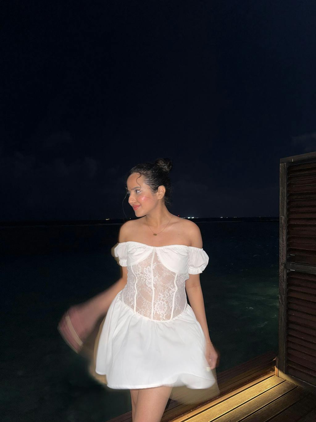 Dreamy and delicate, this white off-shoulder mini dress features a lace corset bodice with front hook detailing and a flowy chiffon skirt. The puffed sleeves and lace bodice add a feminine touch, making it perfect for sunny brunches or beach dates.