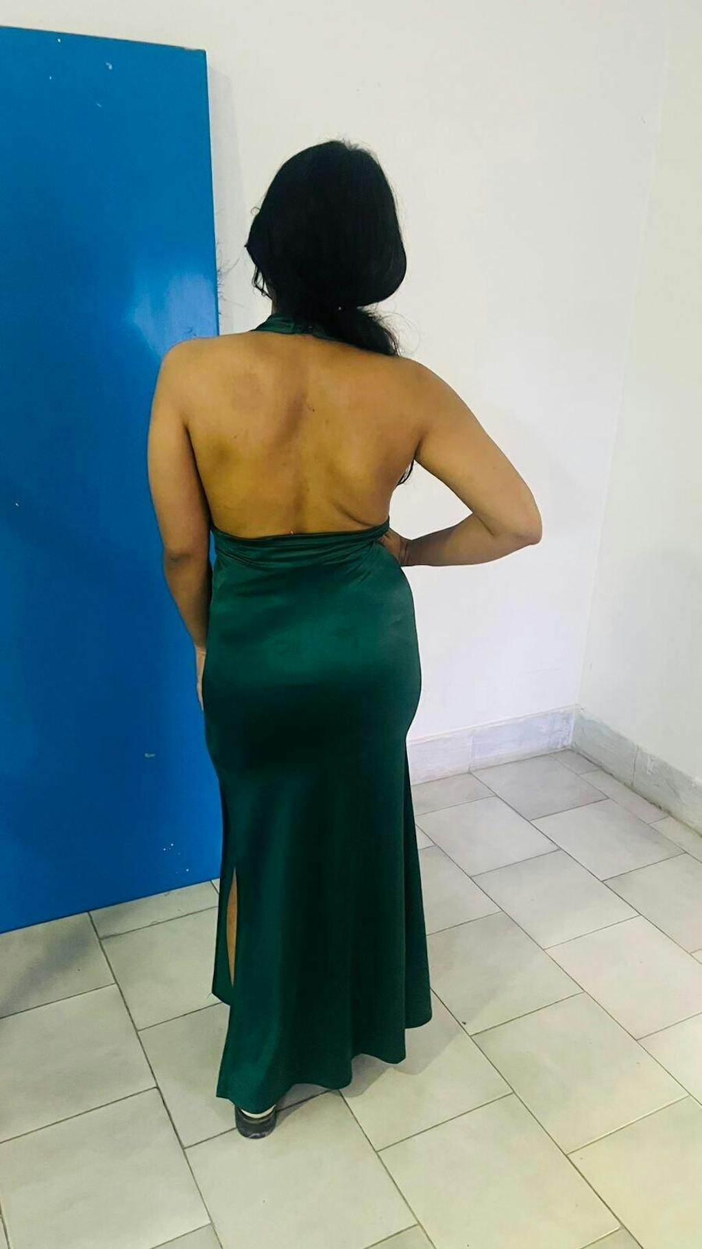 Command attention in this emerald green Halter Neck High Slit Gown featuring a daring plunging neckline, sleek side slit, and open back. The body-hugging fit sculpts your curves for an elegant yet bold look - it’s your ultimate show-stopper.