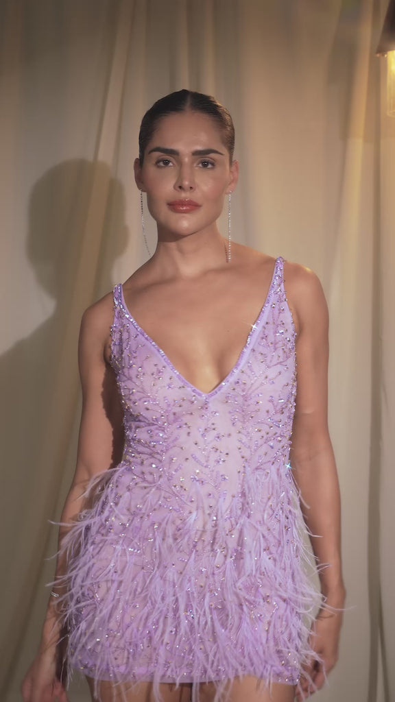 Shop the viral lavender mini with intricate beading and a fluffy feather trim skirt. Perfect party dress for an unforgettable night!