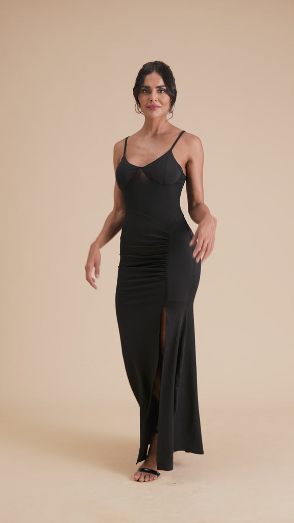 Daring yet elegant, this black evening gown features sheer mesh paneling, a sleek asymmetric cut, and a high side slit for dramatic effect. With its curve-sculpting fit and minimal luxe design, it’s the perfect blend of sultry and sophisticated.