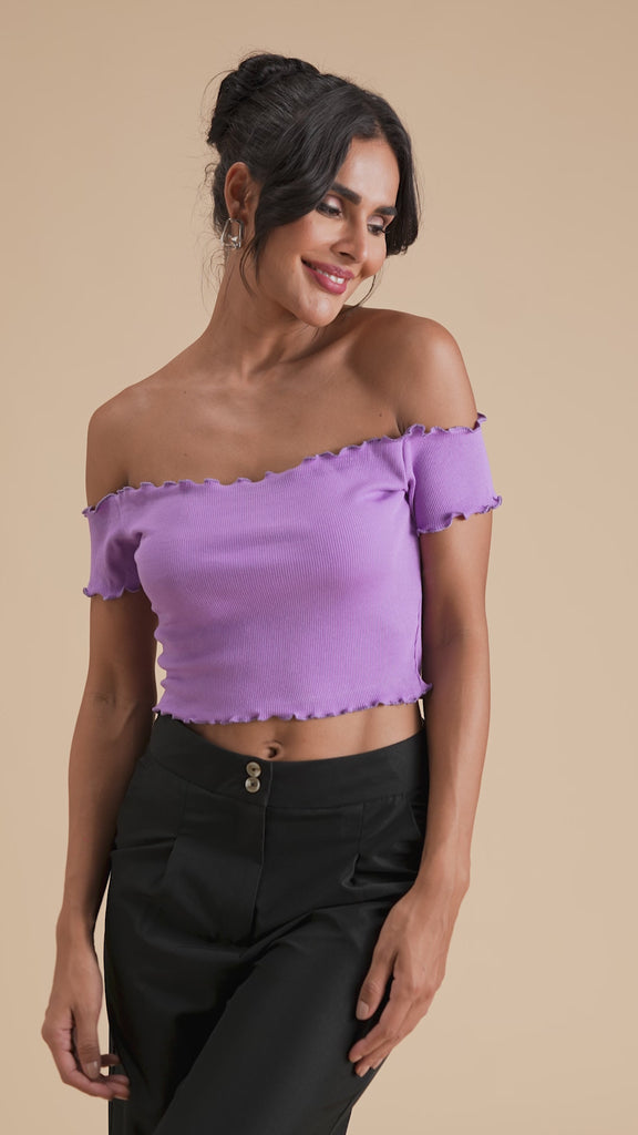 Flirty and fun, this ribbed cotton off-shoulder top hugs your curves and comes with sweet ruffle trims. With its lettuce-edge sleeves and feminine neckline, it’s your go-to for casual days or dress-up brunches. Cute, comfy, and totally versatile.