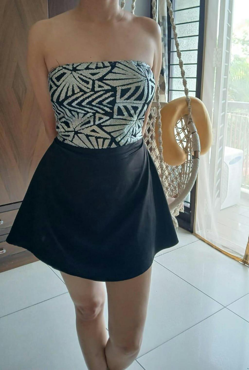 Make a refined statement in our Strapless Sequin & Satin Mini Dress, featuring a sculpted strapless bodice adorned with intricate black and silver sequins. This dress cinches the waist and highlights your silhouette beautifully. The satin mini skirt provides a draped finish, adding a soft contrast to the structured top. Perfect for upscale dinners, date nights, or cocktail parties, this little black dress is pure sophistication and grace, and designed to turn heads.